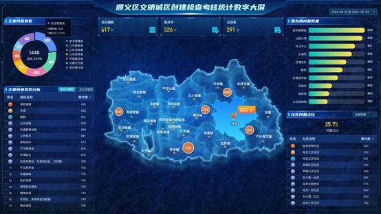 定制化创城平台建设,内置五大指标,聚合检查、申报、随手拍等多场景,数据协同共享赋能精准决策。