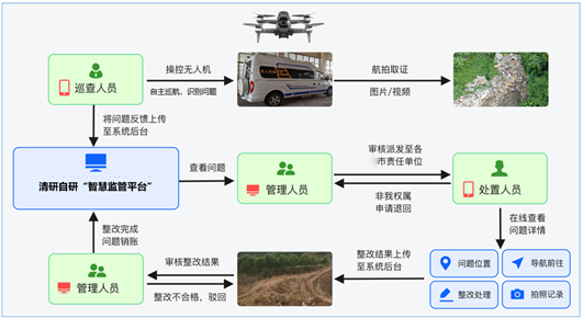 河道精细化管理巡检测评系统,通过智慧采集、智慧识别、智慧处置、智慧管理赋能河道精细化管理巡检工作。形成了“无人机+720º全景采集-AI识别-实地复核-系统流转”的智能化高效巡河管理流程。