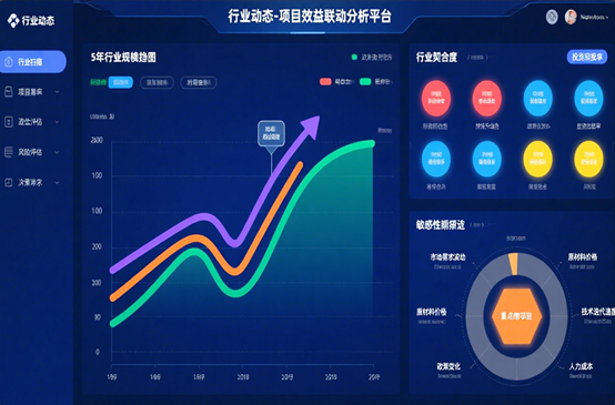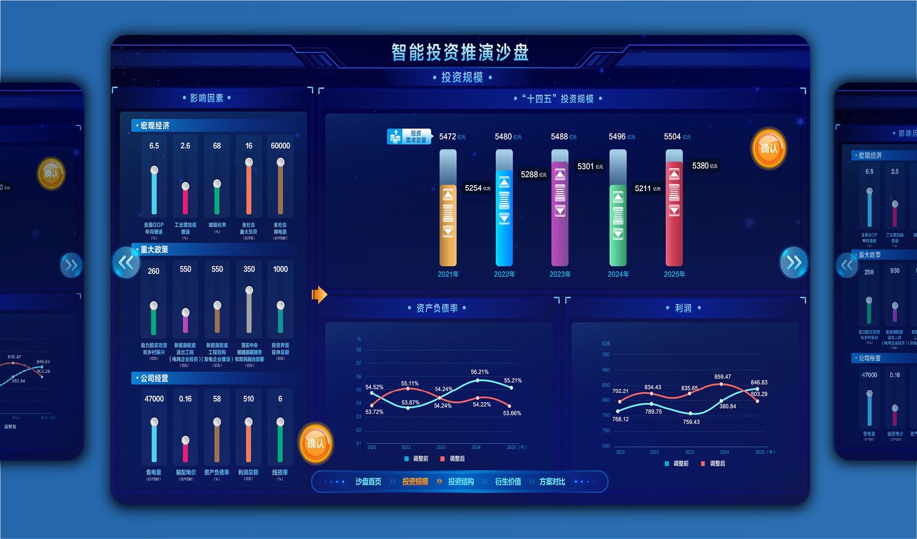 项目简介:基于能源服务大数据与投资测算模型,开发智能投资推演沙盘程序,通过量化分析投资指标,可视化展示分析结果,方便用户清晰、高效了解投资规模与价值。同时,程序内置可控调整的内外部因素变量,实时模拟变量对投资规模、敏感度、衍生价值等纬度的评估与测算情况,并通过项目与规划校核 、战略校核的交互,有效辅助投资科学决策,支撑战略规划精准落地。