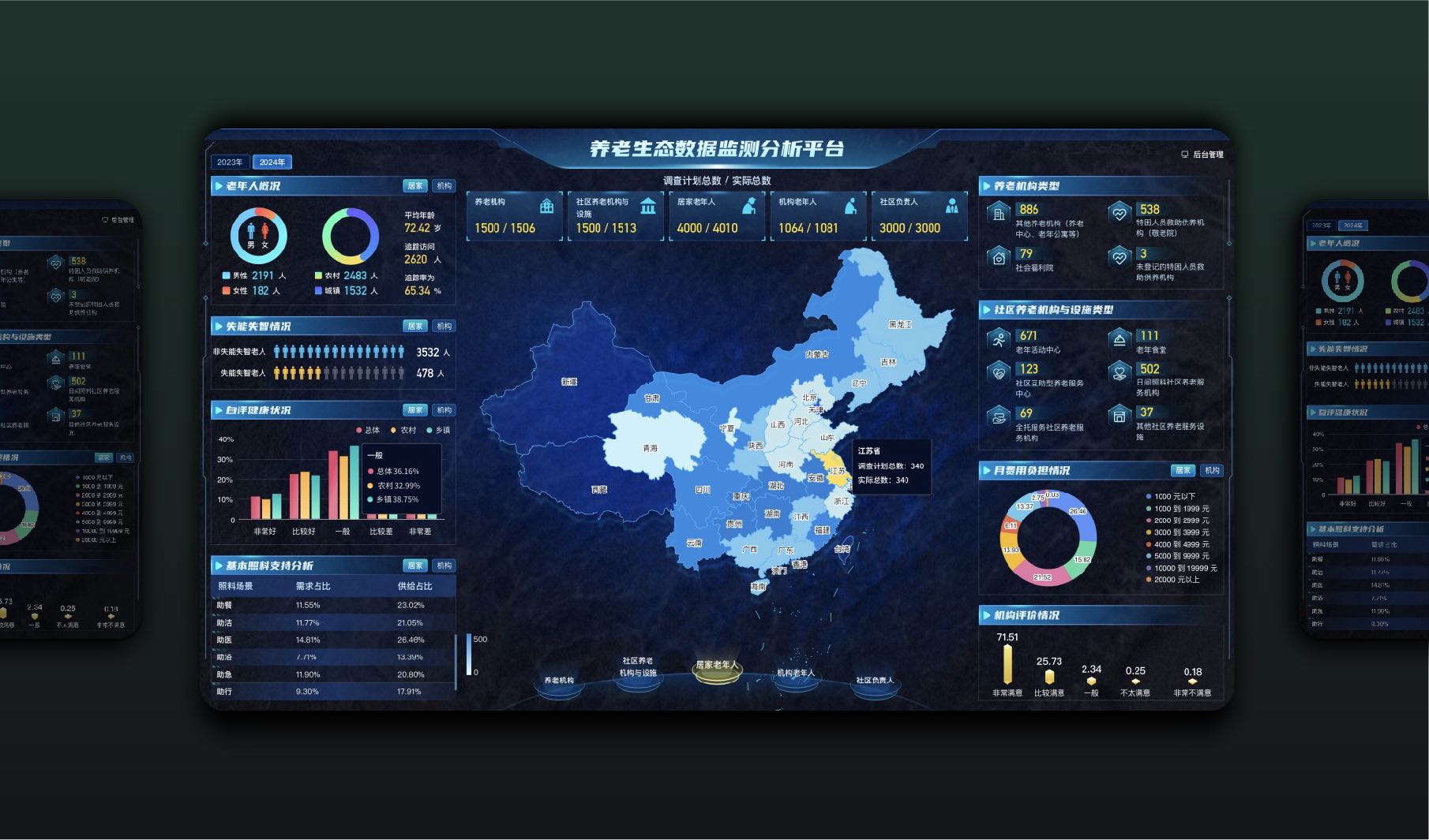 实现养老及民生多维数据融合、存储、分析、可视化及安全共享,打造数据全景驾驶舱。