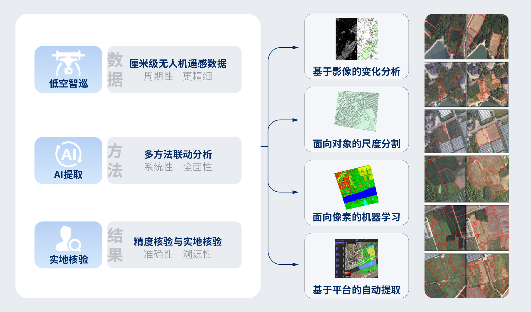 基于无人机遥感数据,构建推堆土、硬化、房屋建筑、道路、临时堆放、水塘、园林草等“非农化”、“非粮化”监测指标,实现耕地疑似“两非”变化图斑自动提取。