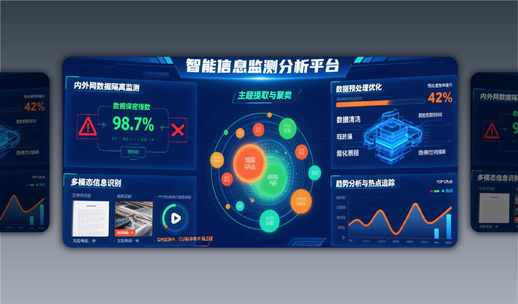 案例简介:基于内外网信息不联通、数据保密难度大等问题,利用大数据、人工智能等技术,拓展更多领域的信息监测分析,深度实现对文本、图片、视频等信息的识别监测,优化数据预处理,对数据主题进行提取和聚类,开展趋势分析、热点分析,自动生成准确、简洁的文本摘要,极大提升信息获取、出来和分析的效率。