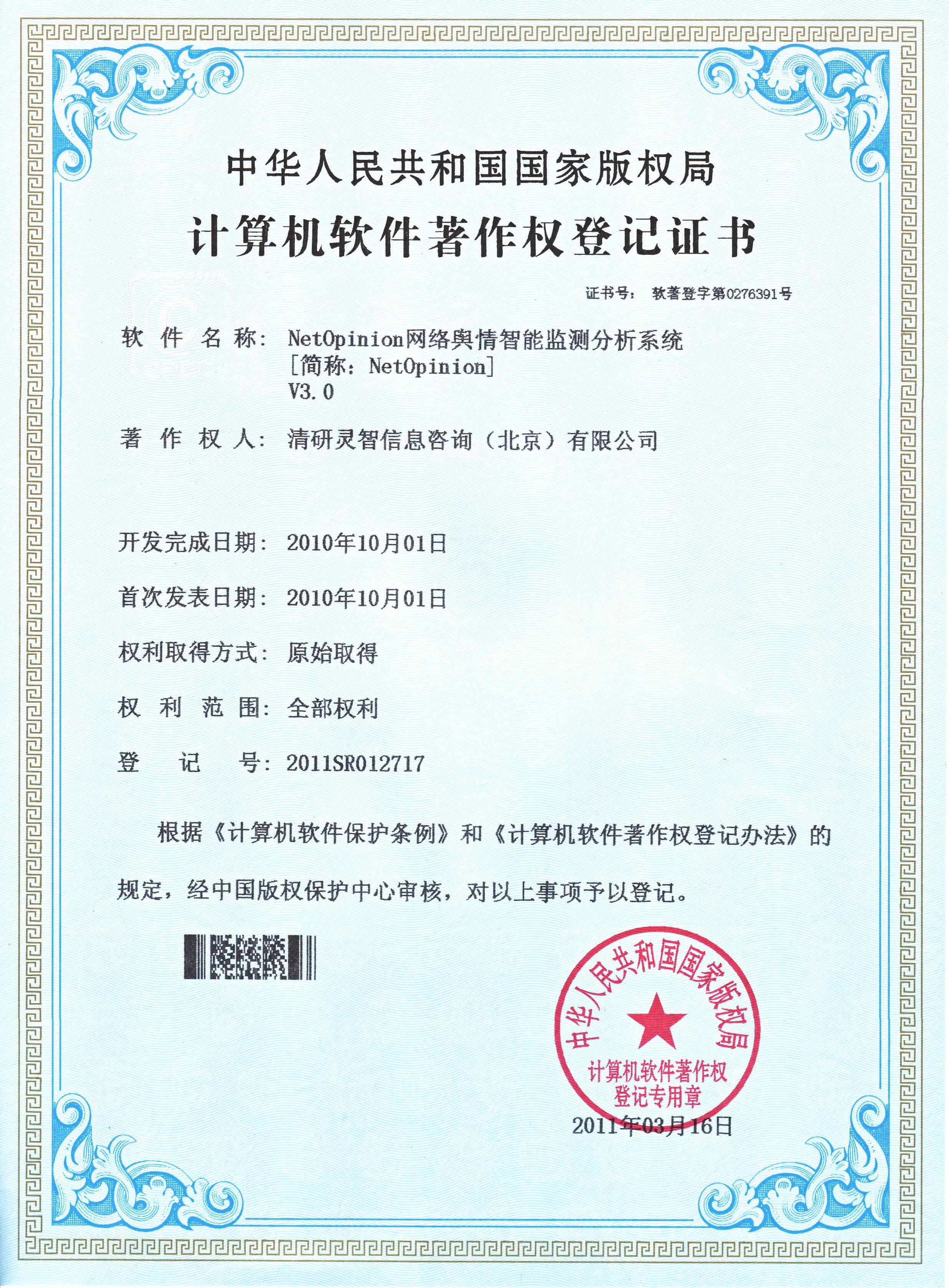 以强大的研发团队和前瞻性的技术视野,成功获得了NETOPINION网络舆情智能监测分析系统、智慧城市环境综合管理平台等共计100+软件著作权。
