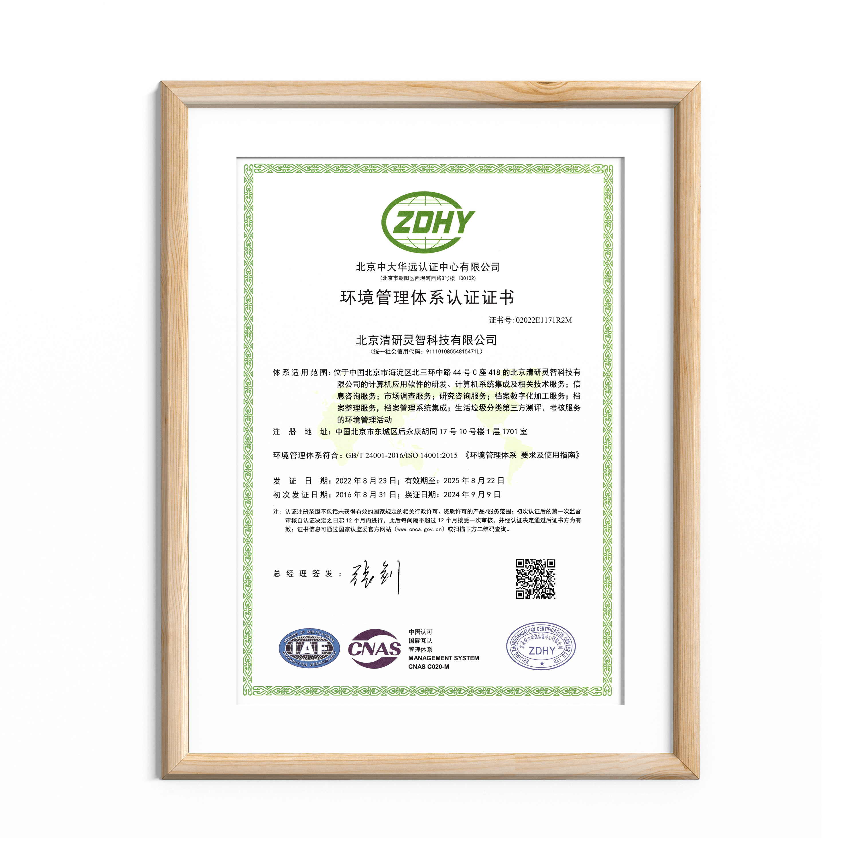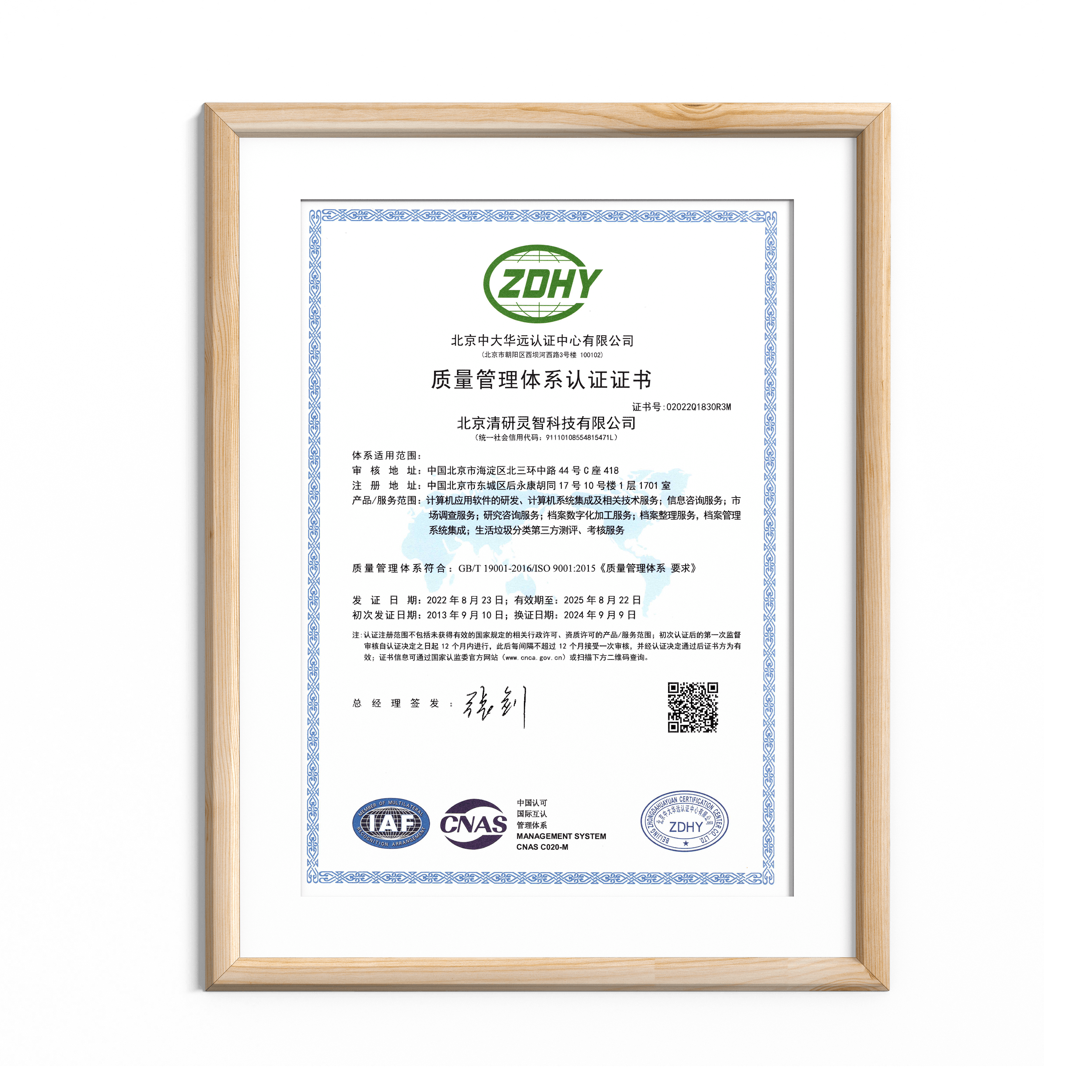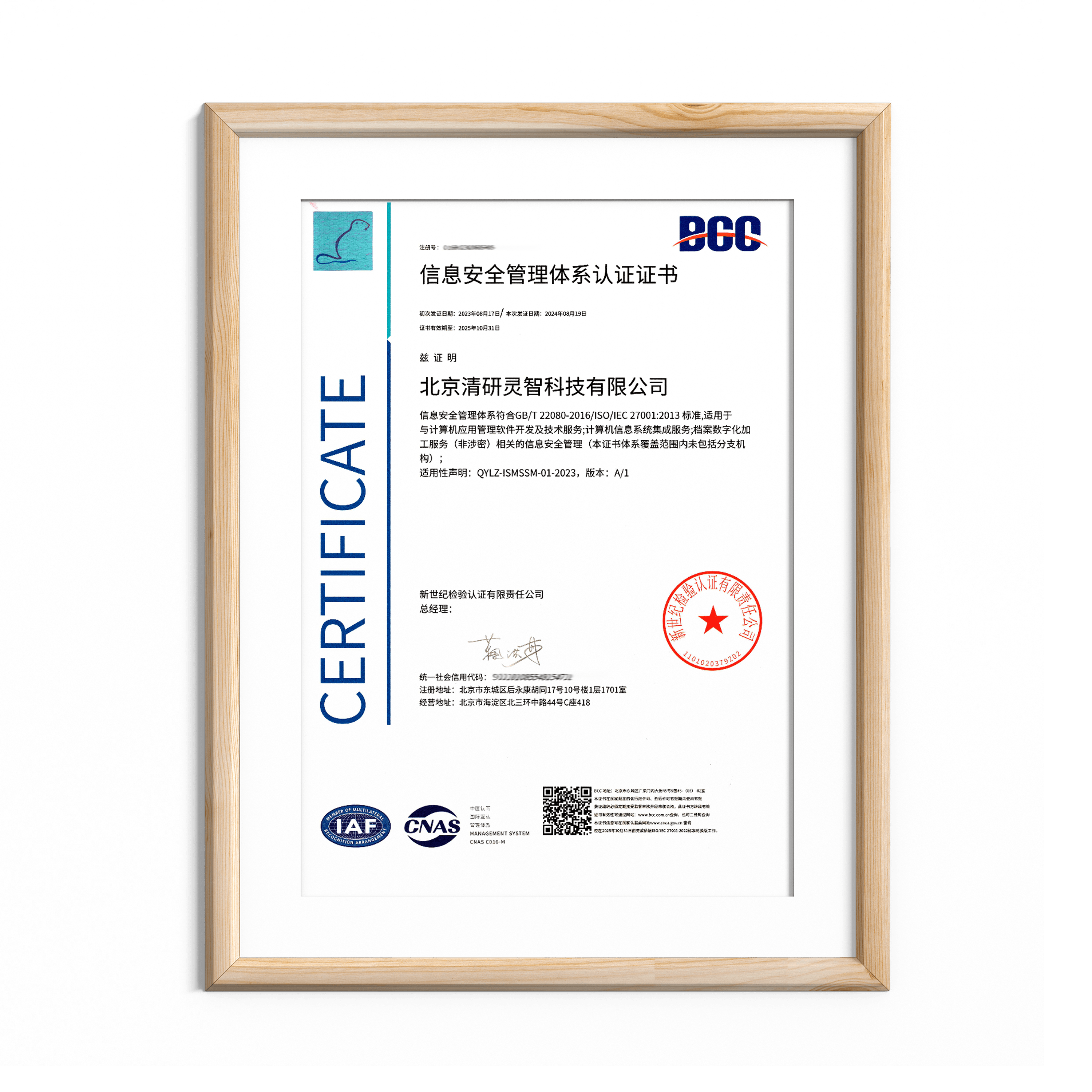 清研集团获得了ISO9001质量管理体系认证、ISO环境管理体系认证、ISO职业健康安全管理体系认证、ISO27001信息安全管理体系认证