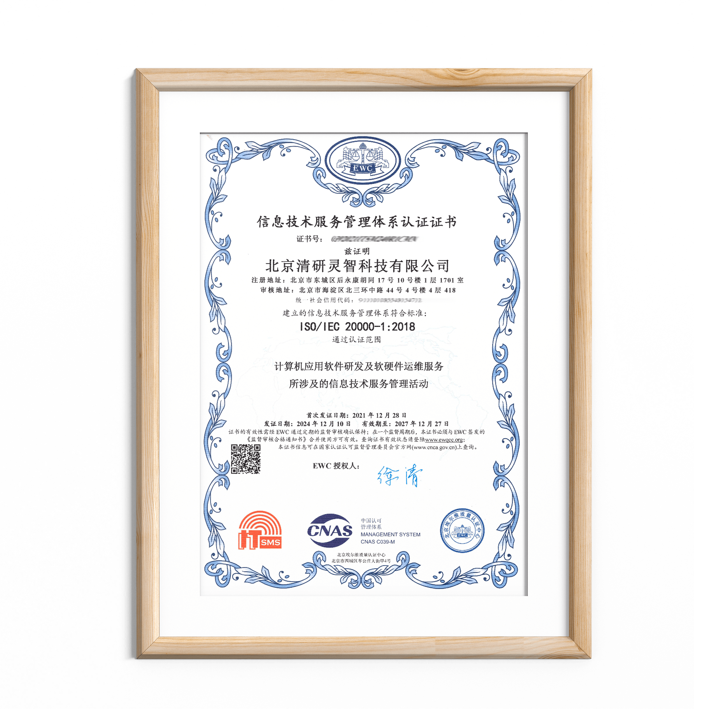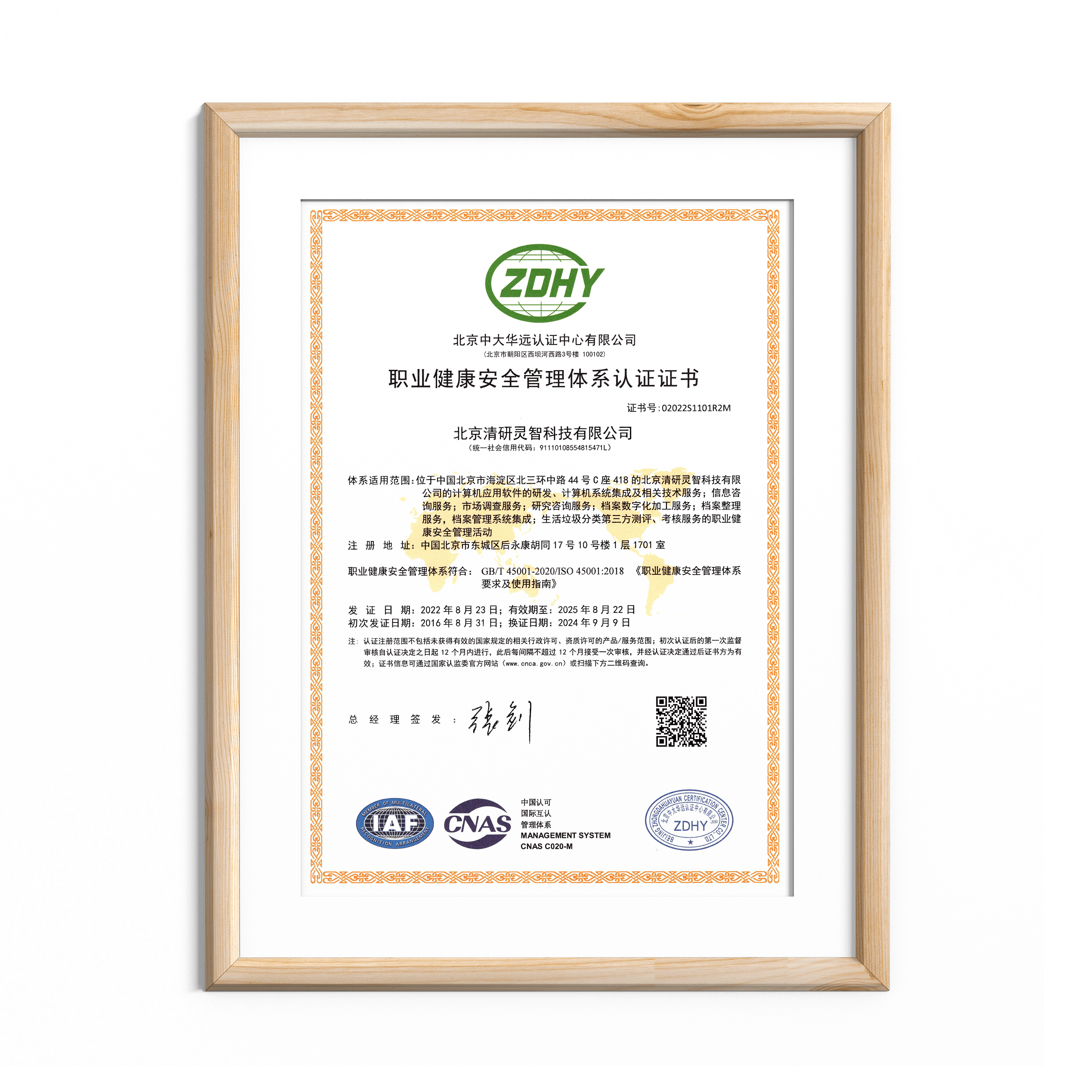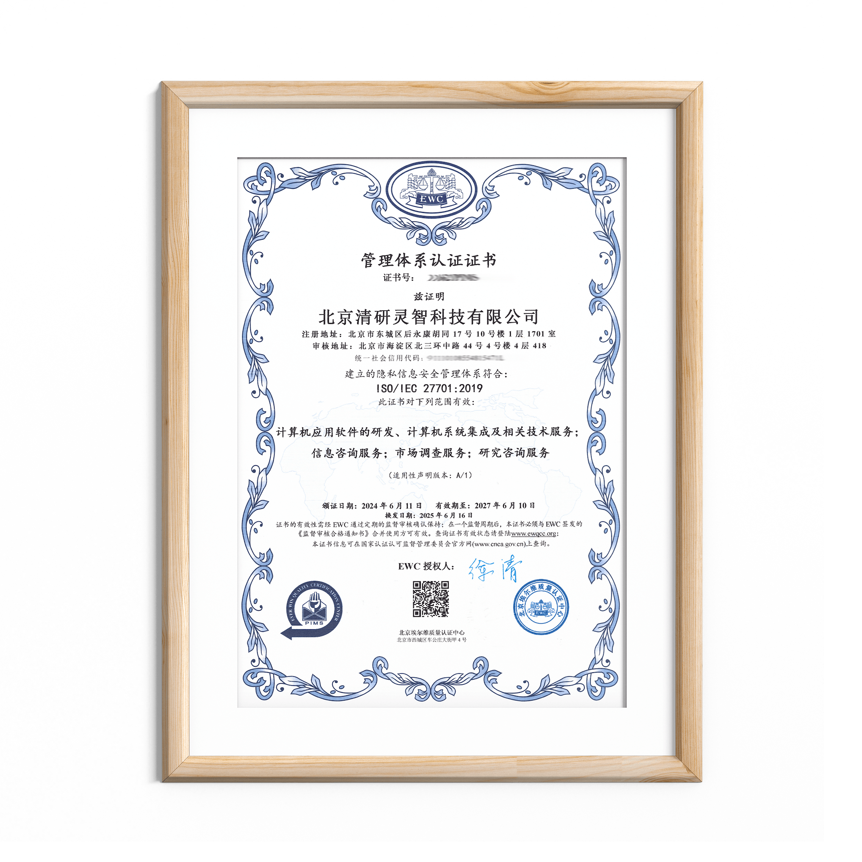 清研集团获得了ISO9001质量管理体系认证、ISO环境管理体系认证、ISO职业健康安全管理体系认证、ISO27001信息安全管理体系认证